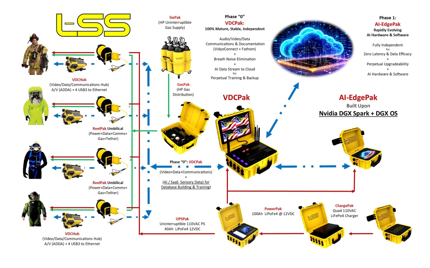 The Artificial Intelligence "Cloud-in-a-Pak." Now in development, the dedicated AI Edge Computer will be built upon the Nvidia DGX Spark. Its functionality will deliver the full power of cloud-based AI predictive analysis plus zero latency integration withing the complete LSS life-support platform. The suite of system applications will include: biometric monitoring, CBRNE detection, Sonar to Video, 360 Threat Detection, Ultrasonic & Laser Systems integration and more.