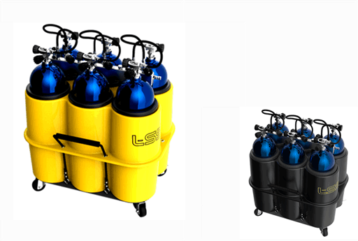 With greater total capacity (528 cft) and half the weight of standard (easy to topple 6’) steel “K” Tank, LSS new SixPak, manifolds six (6) Carbon SCBA cylinders into a single volume. By “cascading” their operation, cylinders are easily “cycled” to create an infinitely uninterruptible air supply.